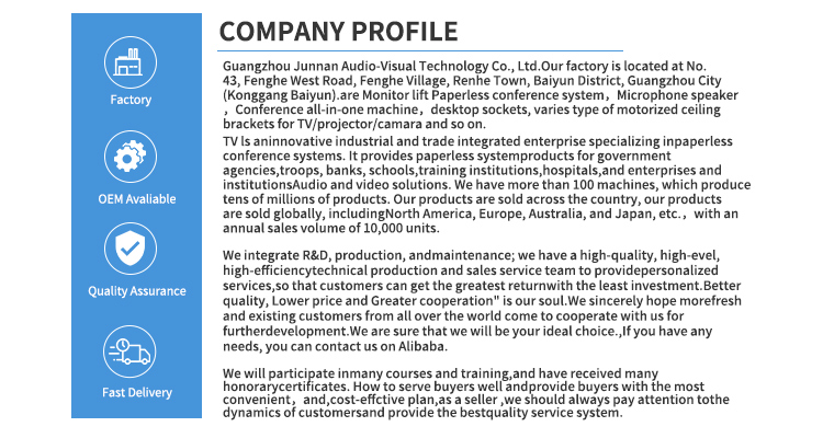 I monitor sollevatori per monitor LCD con schermo OLED elettrico avanzato sono adatti a tutti i tipi di scene, disponiamo di tecnologia di taglio con macchine CNC e tecnologia laser, la più recente tecnologia di sollevamento dello schermo LCD per tavolo da conferenza per garantire che il prodotto sia di altissimo livello. Tutti i nostri sollevatori LCD per schermi OLED appartengono al Made in China, sono disponibili per l'acquisto all'ingrosso, possono essere personalizzati privatamente per i clienti e hanno abbastanza sollevatori per monitor LCD touch screen elettrici in magazzino per supportare la consegna rapida ai clienti. E la nostra attrezzatura Junnan ha una varietà di certificati di certificazione come CCC, certificato CE, ROHS, certificazione ISO, il prodotto è sicuro e di alta qualità, con qualifica di esportazione, è una fabbrica diretta con un prezzo favorevole, ha una propria fabbrica e opera da molti anni.